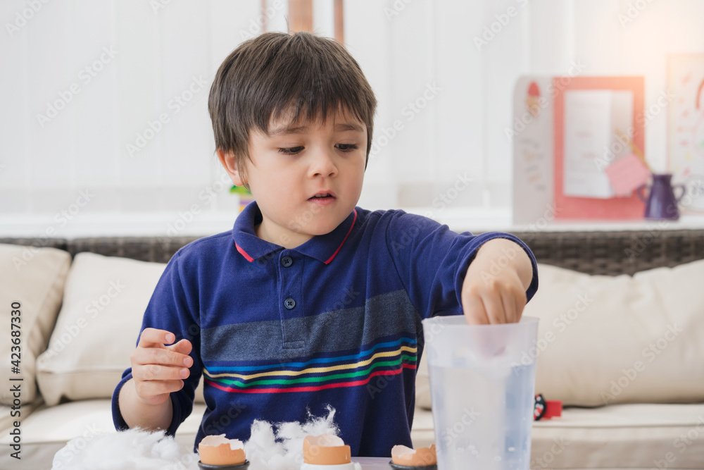 Portrait Kid boy growing seeds in egg shell, Child explorer and learning at home about nature, Active child planting vegetable seed, Activity for Children in Summer