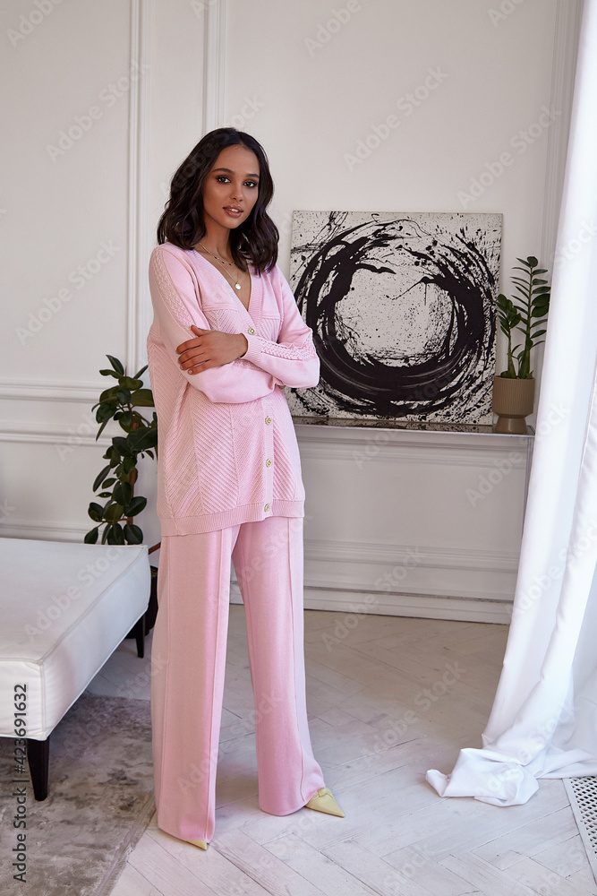 Pretty fashion beautiful woman sexy lady brunette curly hair dark tanned skin wear trend clothes knitted pink pink suit jacket top pants shoes interior room sofa plants spring collection luxury life.