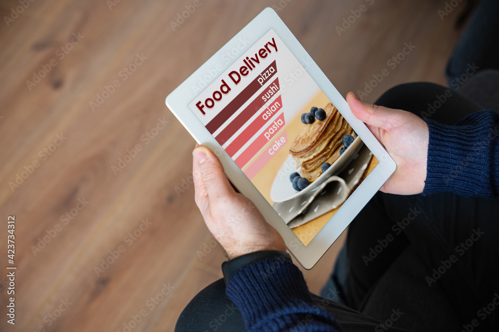 Detail of tablet screen of unrecognizable man sitting on sofa home while choosing takeaway dish by buying it from device app during the lockdown from Coronavirus Covid-19 - Concept of food delivery