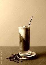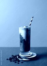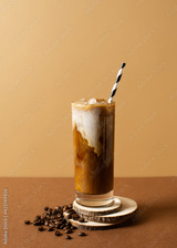 Ice coffee in tall glasses with milk and drinking straw on wooden podiun over brown background