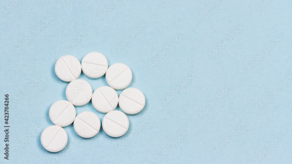 White pills on the blue background, medical banner