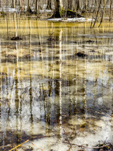 In the wood the spring begins, trees and bushes stand in water, a sunny day, patches of light and reflection on water, trunks of trees are reflected in a puddle, streams flow, conceals snow