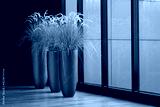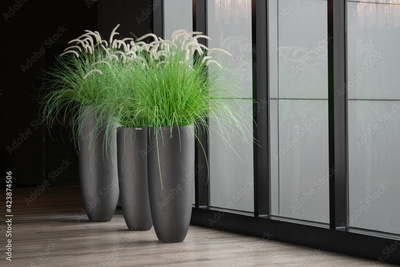 Beautiful green plants in large metal plant holders by window in modern urban space
