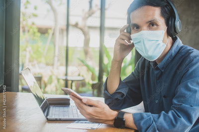 Man wear facemask working laptop in cafe , People using phone , Asian man use headphone listening music