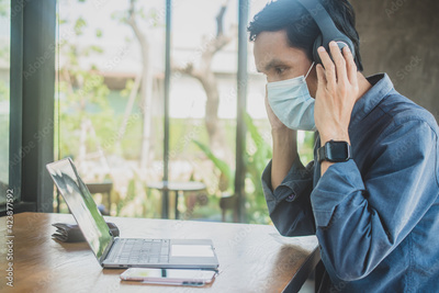 Man wear facemask working laptop in cafe , People using phone , Asian man use headphone listening music
