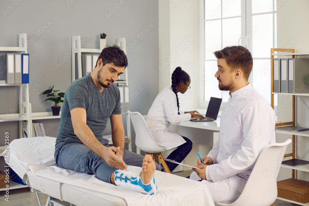 Medical examination and consultation at traumatologist appointment. Doctor and patient have conversation during check-up for leg injury in hospital ward. Nurse assistant typing prescription on laptop