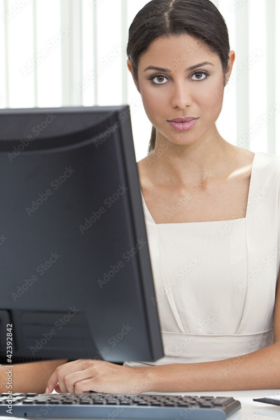 Hispanic Latina Woman or Businesswoman in Office Using Computer