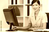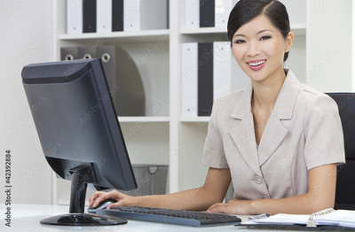 Asian Chinese Woman or Businesswoman Using Computer In Office
