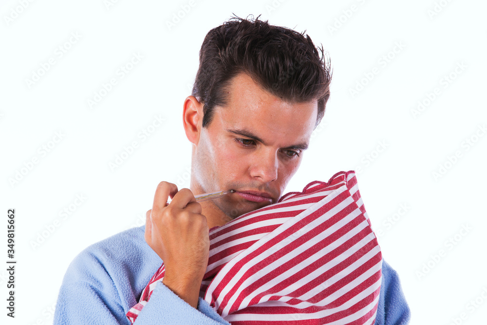 young hispanic man close to a neon light with blue and red lights