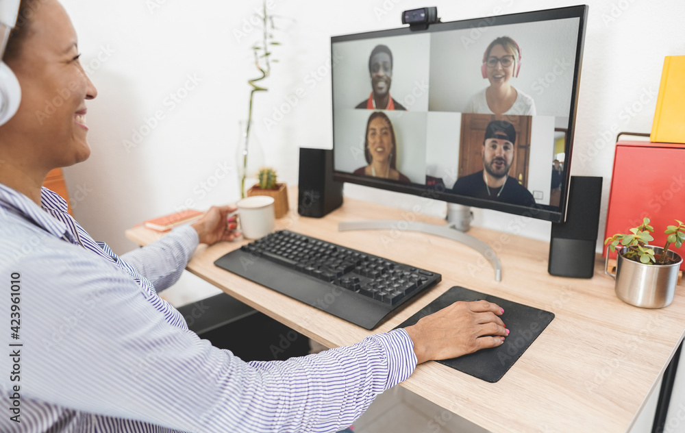 Woman teacher doing video call with students from home - Social distance beetween people and technology concept - Focus on hand