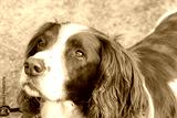 Portrait view of a senior Springer Spaniel. Seen looking at his owner while at for his gentle exercise.