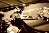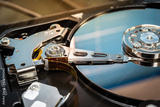 Close up of hard disk hard disk magnetic tape inside, open cover hard disk in computer or server. Technology background.