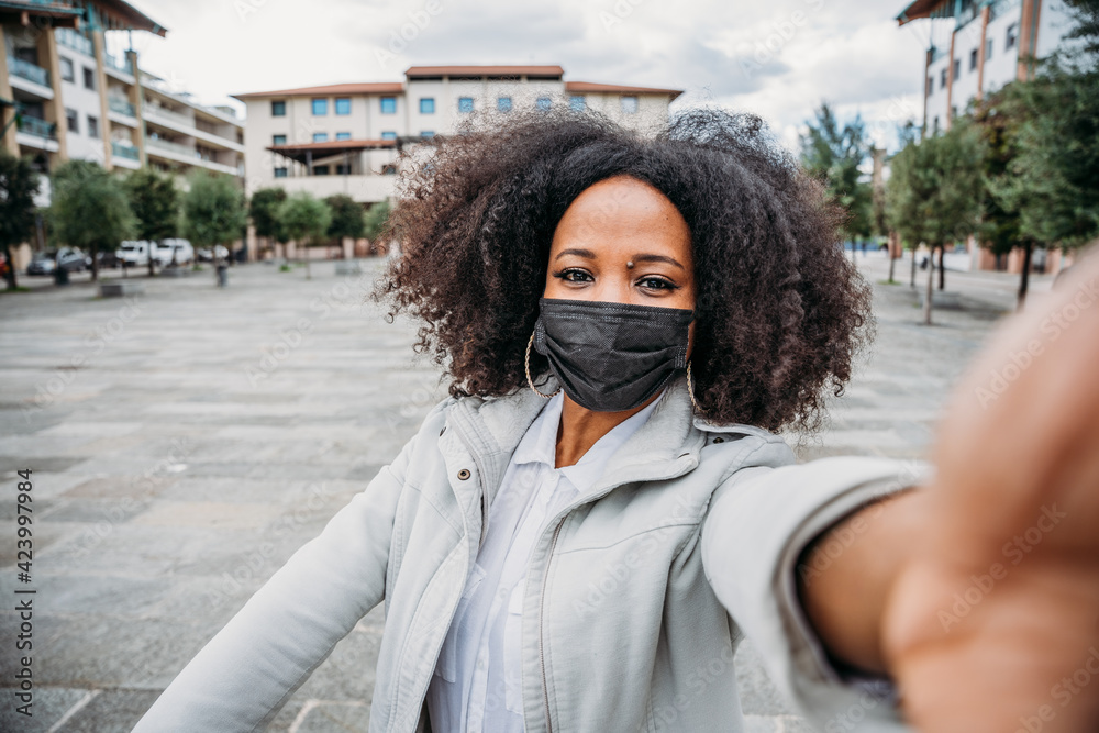 Young woman takes a selfie with her smartphone in the square in the city on the way home to work wearing the protective face mask against the Coronavirus Covid-19 pandemic - Concept of commuting