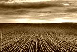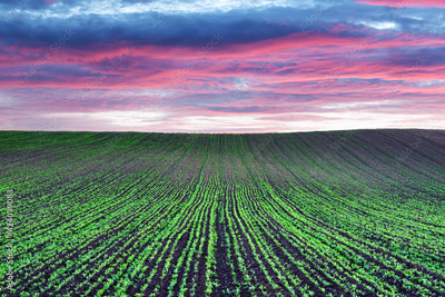 Abstract rural landscape with agricultural field and purple sunset sky. South Moravia region, Czech Republic