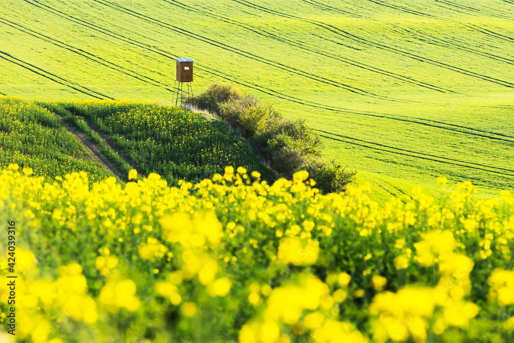 Yellow rape field with hunting tower and lines of tracks. Landscape photography