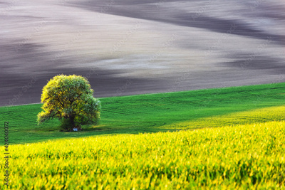 Rural landscape with agricultural fields and tree on spring hills. South Moravia region, Czech Republic