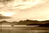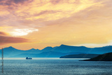 Beautiful summer sunset on Faroe Islands, Denmark. Lonely ship in the coastal waters. Landscape photography