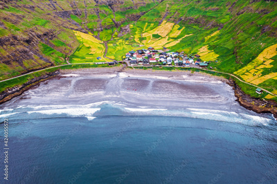 Aerial drone photo flying over Tjornuvik beach on Streymoy island, Faroe Islands, Denmark. Landscape photography