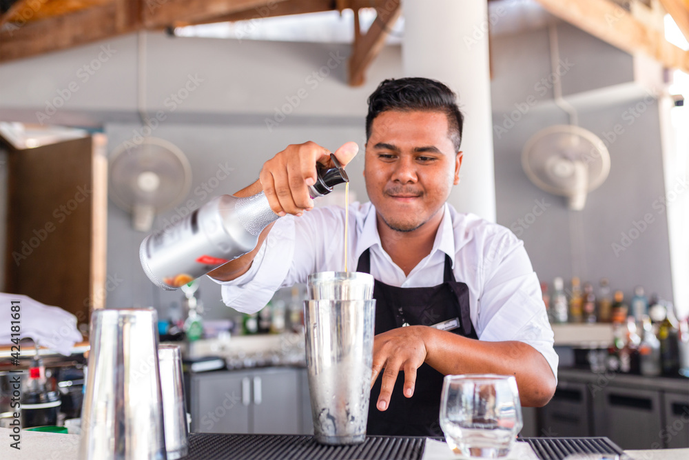 Bartender is making cocktail at counter bar.