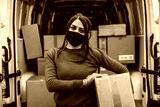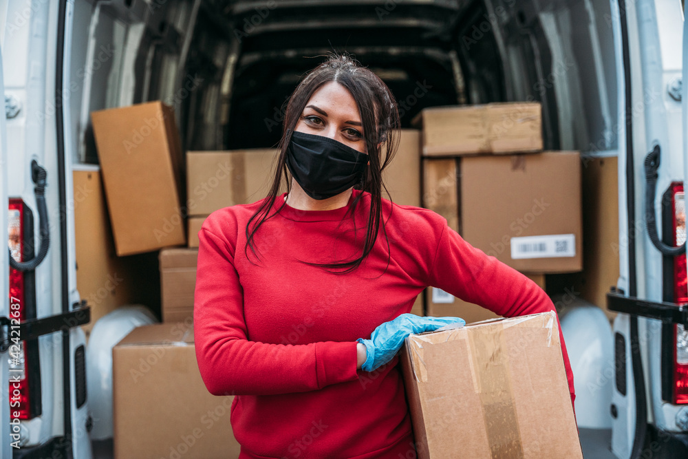 Young woman courier delivers a package to customer address holding parcel in hands wearing face mask and gloves during global pandemic from Coronavirus - Concept of delivery