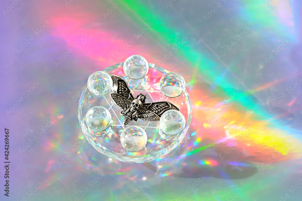 clear quartz crystals and Death's head hawk moth butterfly jewelry, on holographic background. relaxation, meditation, spiritual healing crystal practice. wiccan modern magic. Feng Shui, Good energy