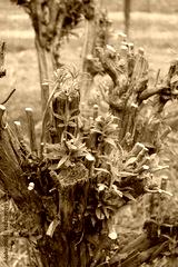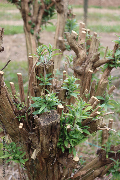 Pruned branches of Buddleja or Butterfly bush with new fresh green leaves on springtime