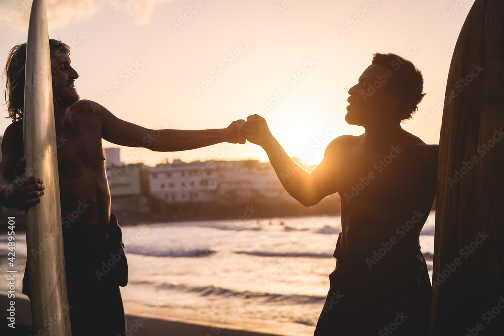 Multiracial surfer men having fun together on the beach - Extreme sport and friendship concept
