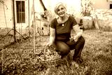 Portrait of an adult woman with the basket with the vegetables harvested in the urban garden in her field near the house - Concept of sustainability and self-maintenance
