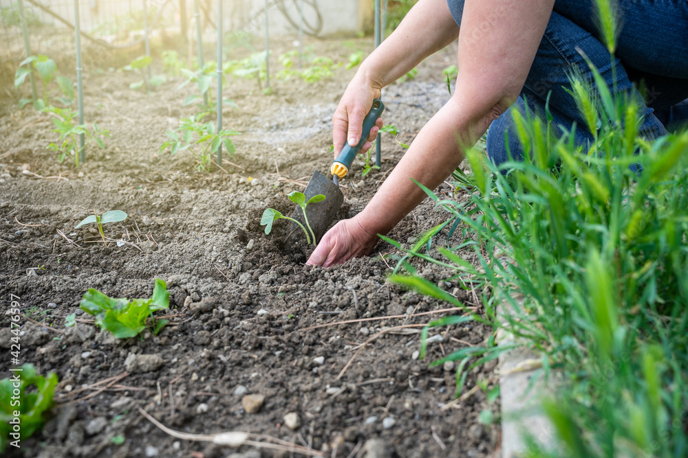 Friendly adult woman plants a small plant in the home garden - Female works the land in her social urban spaces in anticipation of the harvest - Concept of ecological and sustainable