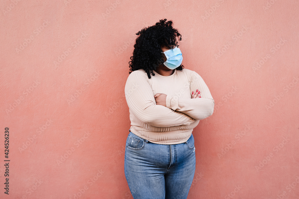 Curvy african girl wearing safety mask with crossed arms outdoor - Focus on face