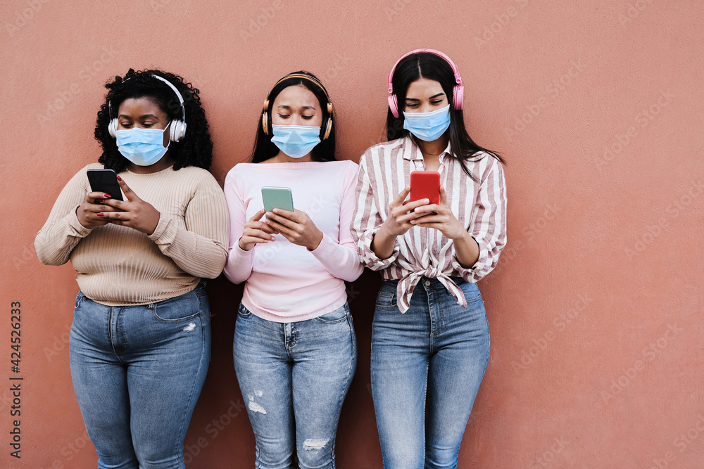 Happy multiracial young friends wearing safety masks while using mobile phones outdoor - Main focus on left woman hands