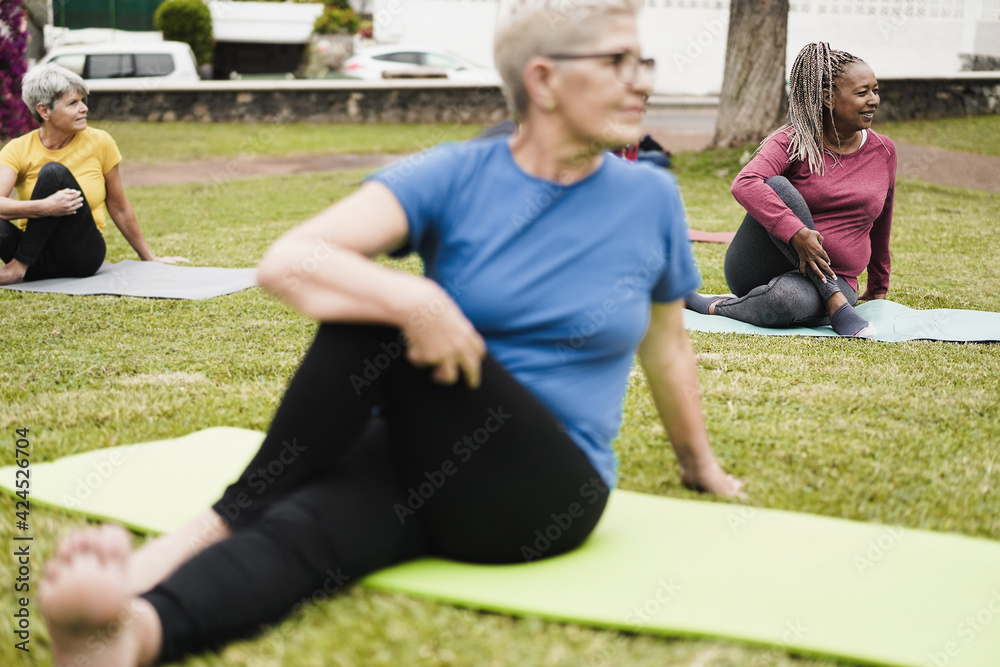 Senior people doing yoga class keeping social distance at city park - Focus on front faces