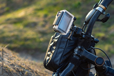 Action Camera on a bike with a bikepacking bag in a waterproof case against the backdrop of nature.