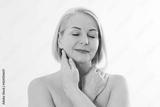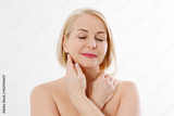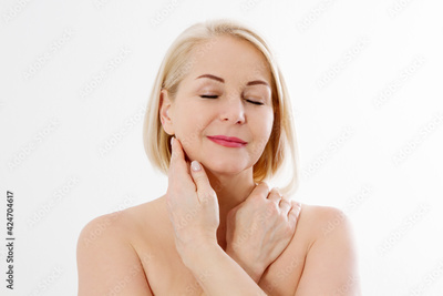 Beauty middle age woman face portrait. Spa and anti aging concept Isolated on white background. Plastic surgery and collagen face injections. Wrinkles and menopause. Mock up. Copy space