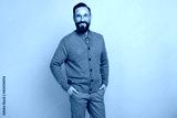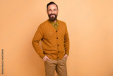 Photo of optimistic brown hair man stand wear spectacles brown sweater isolated on beige color background