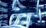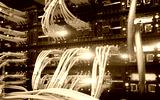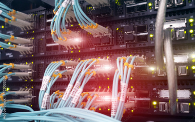 Fiber Optic cables connected to an optic ports. Optical communication.