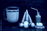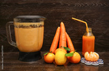 Small bottle of orange juice stands on black wooden table. carrote, mandarine lie near. Refreshing drink, image with copy space