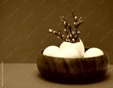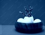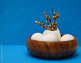 white Easter eggs and blooming branches on blue paper background. empty copy space