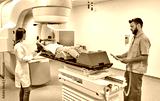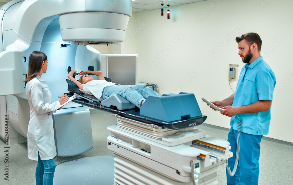 A young woman is undergoing radiation therapy for cancer under the supervision of doctors in a modern cancer hospital. Cancer therapy, advanced medical linear accelerator.