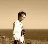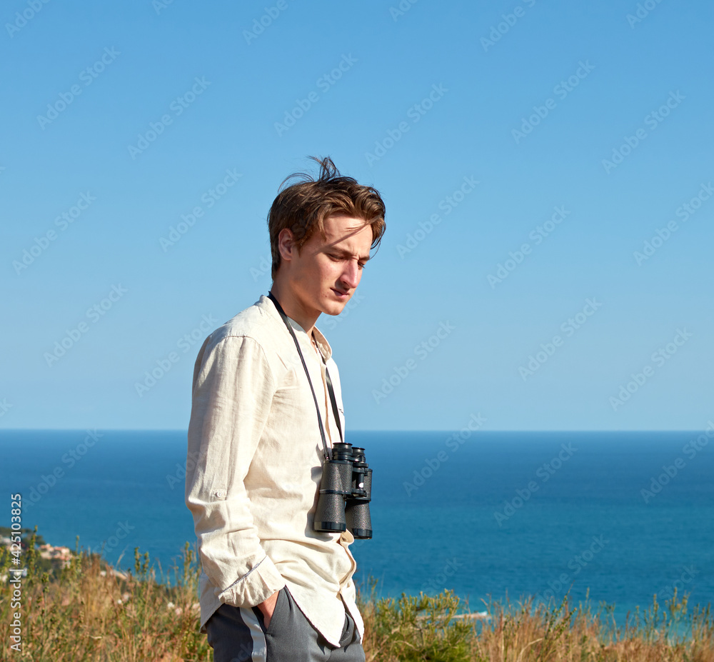 A portrait of an attractive young man with binoculars hanging around his neck posing for the camera in front of lovely sea scenery-vertical shot