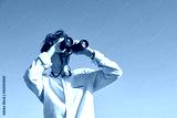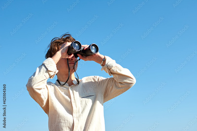 A young caucasian male looking at a view with binoculars under the bright blue sky