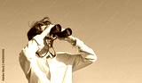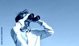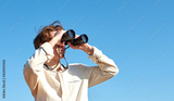 A young caucasian male looking at a view with binoculars under the bright blue sky