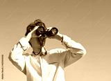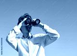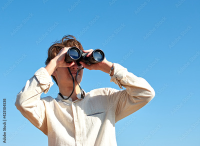 A young caucasian male looking at a view with binoculars under the bright blue sky