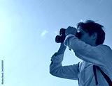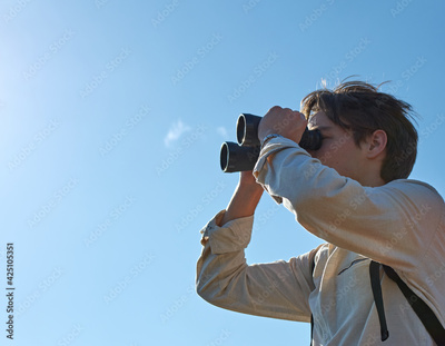 A shallow focus shot of a young man from Spain in a white shirt with a backpack looking through binoculars at daylight