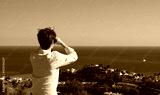 A closeup of an adventurous young explorer looking through binoculars over the town by the sea
