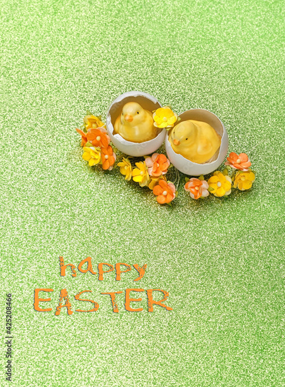 Happy Easter greeting card. Easter chickens in eggs and flowers on green glittering background.