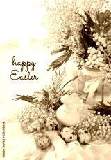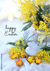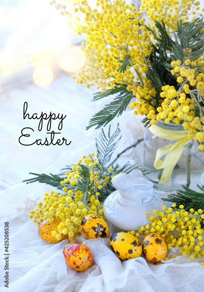 Happy Easter greeting card. decorative Easter rabbit, mimosa flowers and colorful eggs. spring festive seasonal composition.