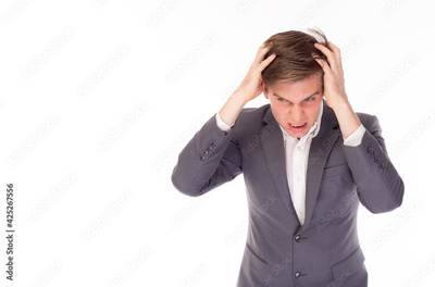 Portrait frustrated and angry business man in panic standing over isolated on white background Serious Exhausted work stressed Expression face concept Guy touching on head feeling tired suffering work