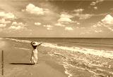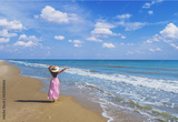 Seascape with beautiful sky. Woman on the beach, summertime. Young happy woman in a long pink dress and straw hat walking barefoot on the seaside. View from above
