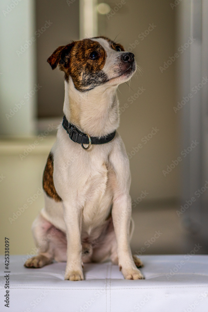 Portrait of a dog on white stool. .Jack russel chihuahua hybrid..